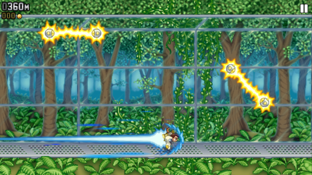 Jetpack Joyride – это смесь классического раннера и механики Line Birds. Герой движется с постоянной скоростью слева на право. По пути ему попадаются многочисленные препятствия, которые необходимо перелетать. Если коснуться экрана пальцем, то персонаж немедленно взлетит к потолку. И чем больше вы будете жать – тем выше он будет подниматься. В этом примитивном игровом процессе заложен глубокий геймплей, который заставляет постоянно совершенствовать свои навыки и все дальше и дальше пробираться по коридорам непонятной лаборатории.